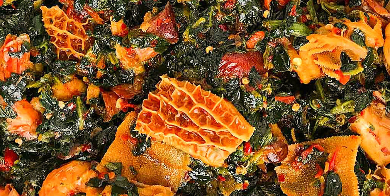 Efo-riro served with assorted meats and prawns.